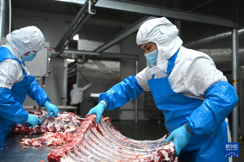 1月6日,工作人员在宁夏固原市泾源县源牛农牧科技有限公司生产车间加工黄牛肉。