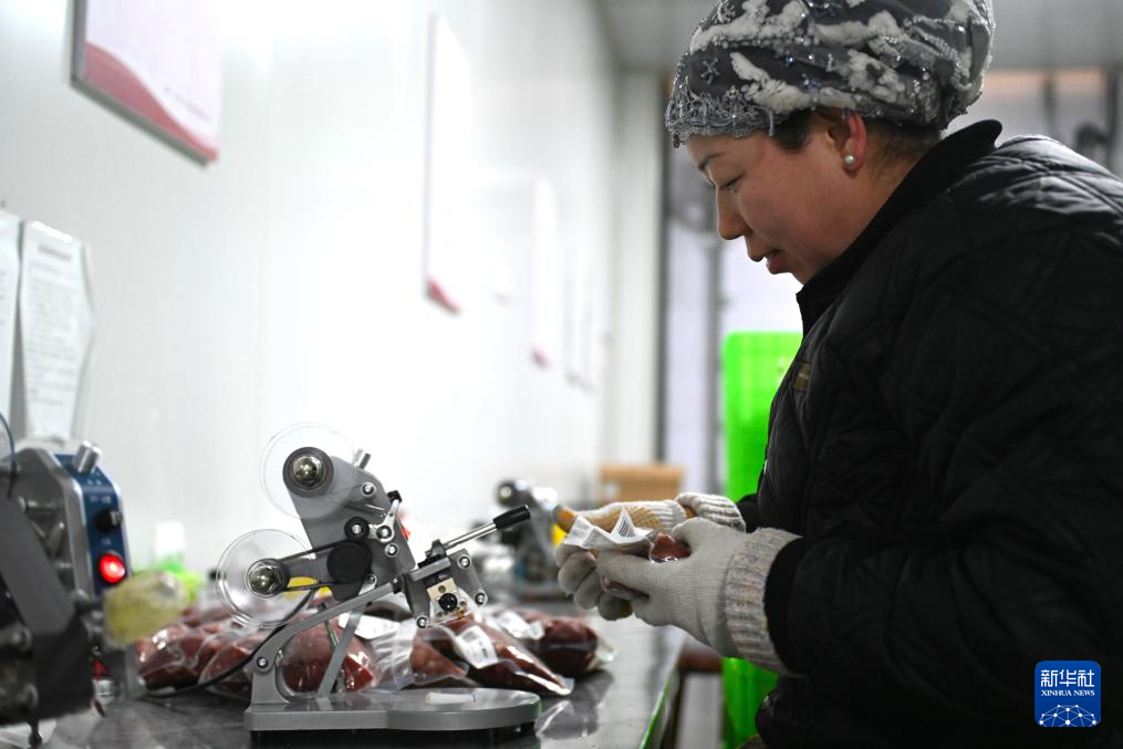 1月6日,工作人员在宁夏固原市泾源县源牛农牧科技有限公司为黄牛肉产品贴标签。
