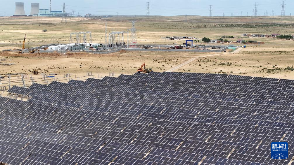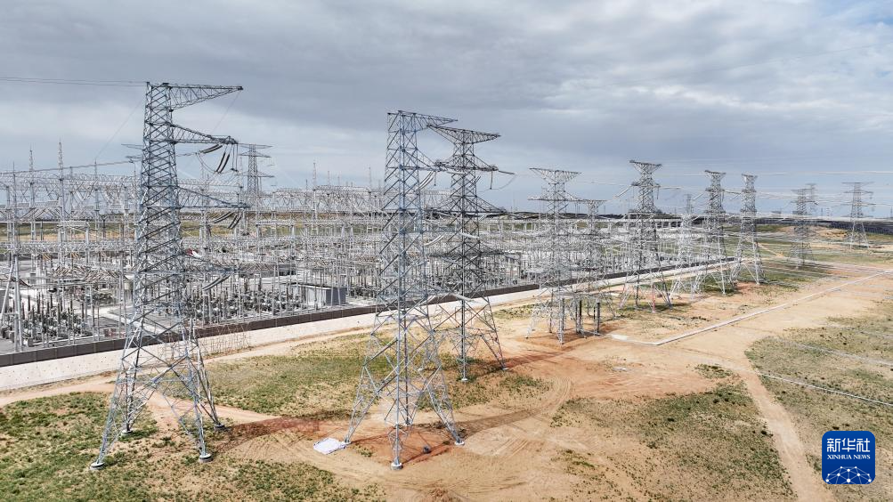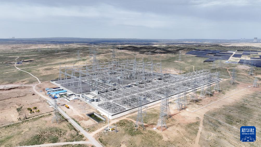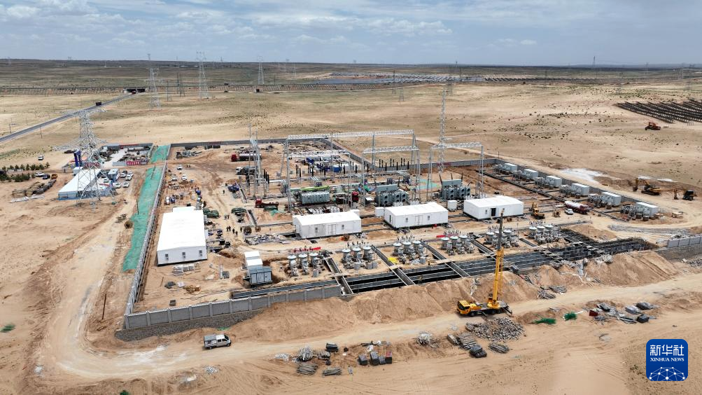 6月8日拍摄的宁国运灵武100万千瓦光伏复合项目330千伏输变电工程线路终点——北地750千伏变电站(无人机照片)。