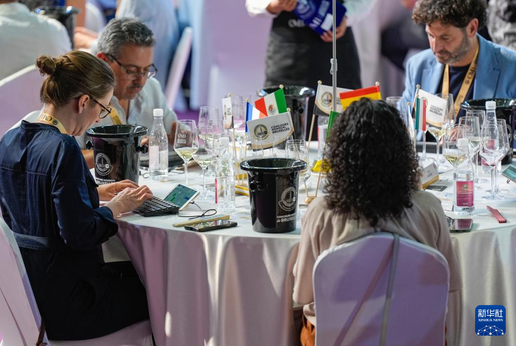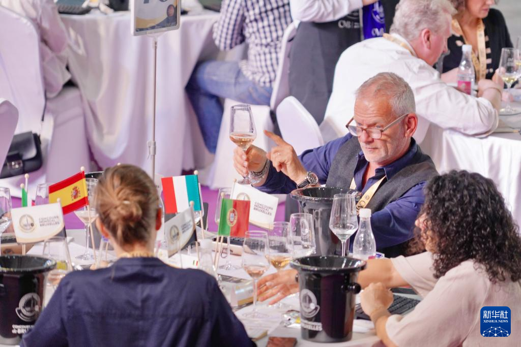 6月10日,在宁夏银川举办的第32届布鲁塞尔国际葡萄酒大奖赛上,品酒师品鉴参赛葡萄酒。新华社记者 杜涓涓 摄