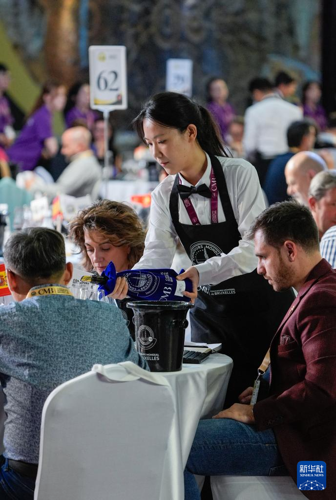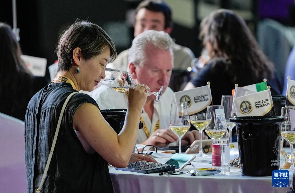 6月10日,在宁夏银川举办的第32届布鲁塞尔国际葡萄酒大奖赛上,品酒师品鉴参赛葡萄酒。新华社记者 杨植森 摄