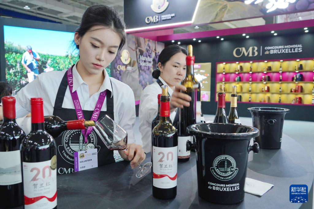 6月10日,在宁夏银川举办的第32届布鲁塞尔国际葡萄酒大奖赛现场,志愿者在展示区为来宾提供宁夏贺兰山东麓产区葡萄酒。新华社记者 杜涓涓 摄