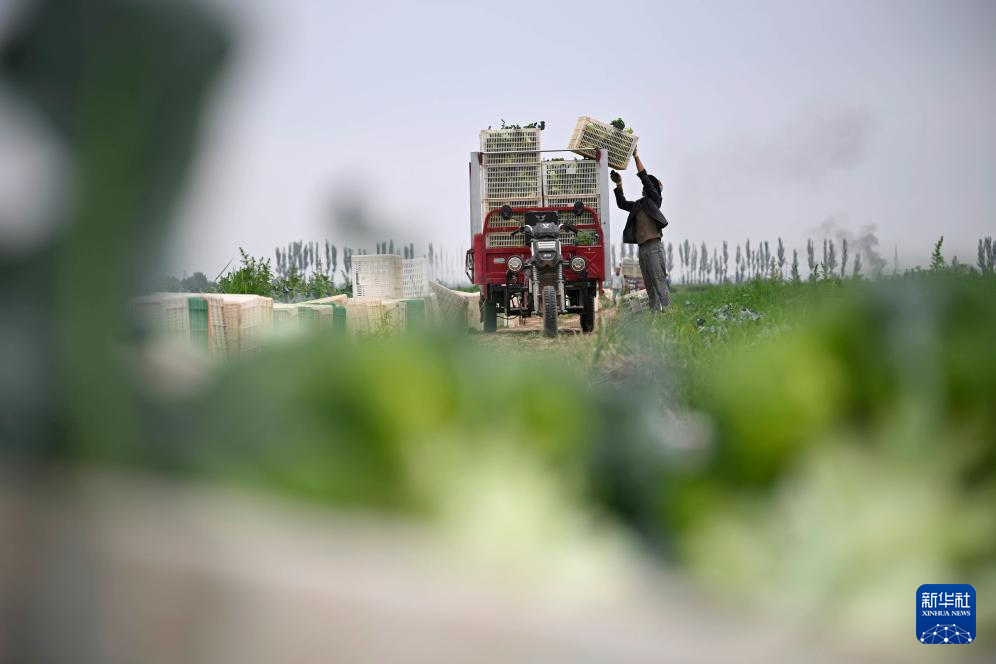 6月20日,工人在位于银川市贺兰县立岗镇的供港蔬菜种植基地采摘菜心。