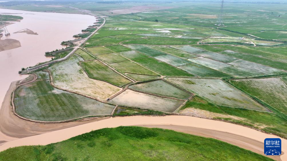在宁夏贺兰县境内拍摄的黄河滩涂湿地(无人机照片,6月22日摄)。