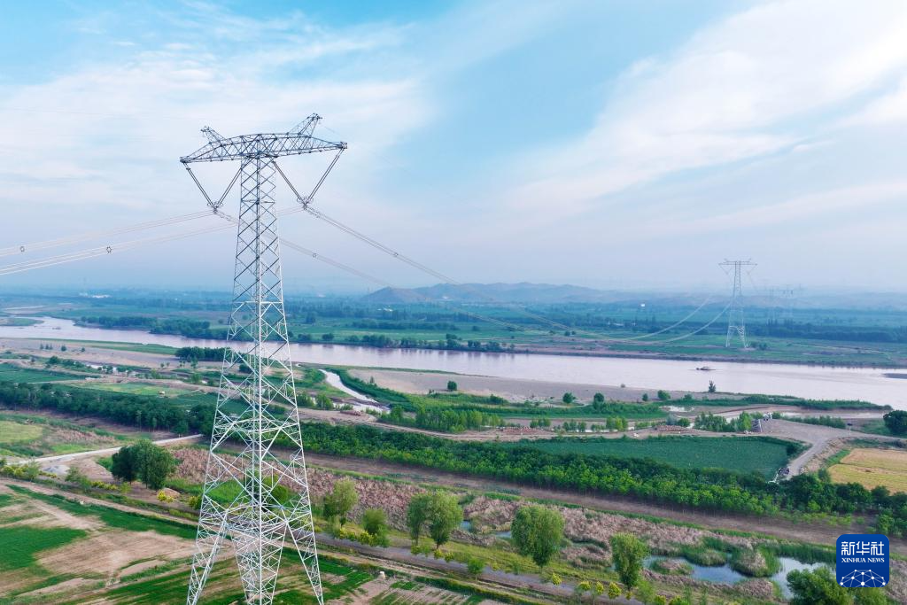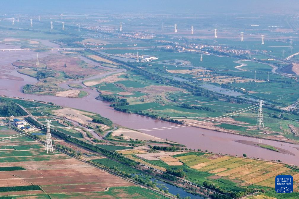 这是6月29日拍摄的“宁电入湘”工程宁夏中卫市境内跨黄河段线路(无人机照片)。新华社发(袁宏彦 摄)