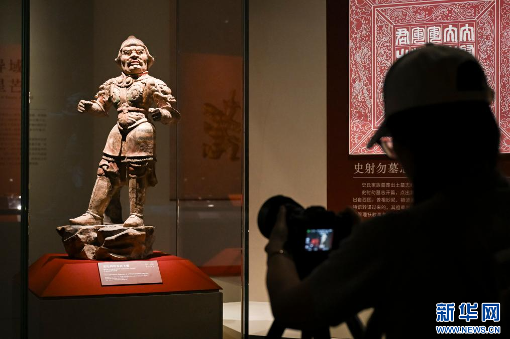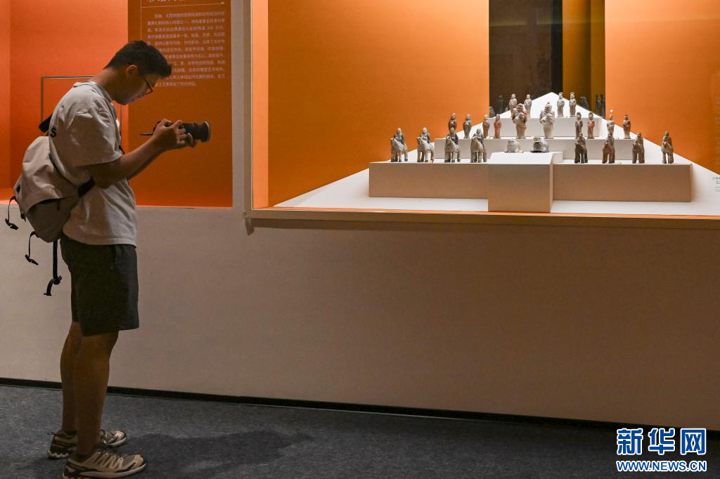 7月8日,媒体人员在“宁夏固原文物精品展”上拍摄展品彩绘陶俑群。