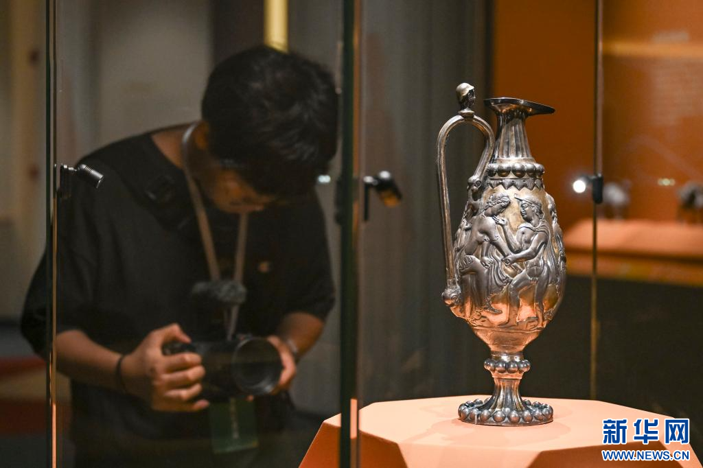 7月8日,媒体人员在“宁夏固原文物精品展”上拍摄展品鎏金银壶。