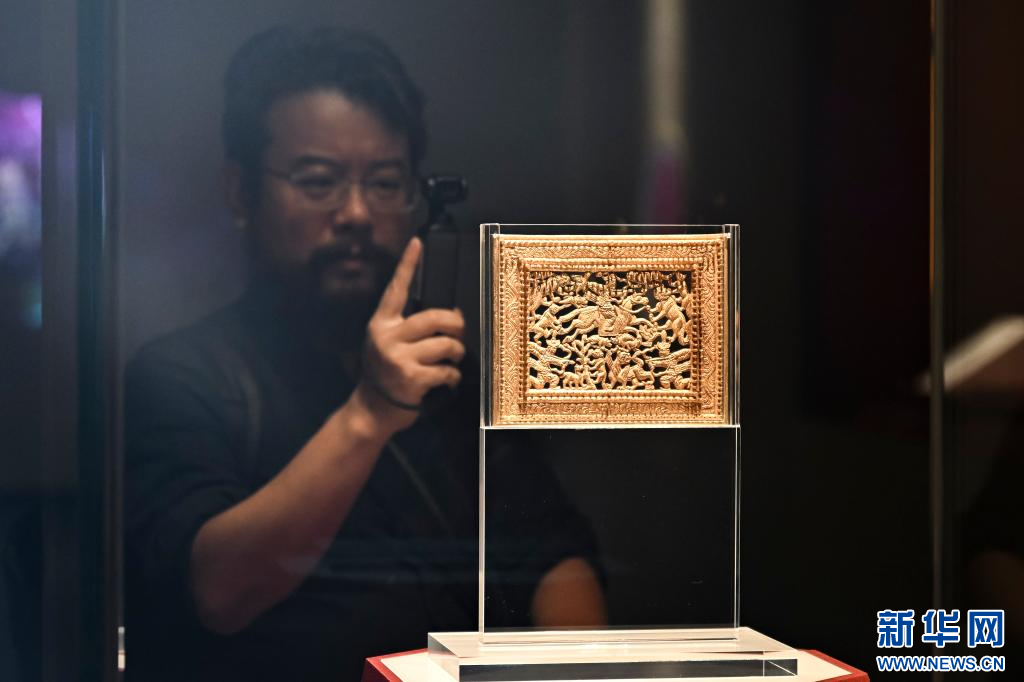 7月8日,媒体人员在“宁夏固原文物精品展”上拍摄展品狩猎图金方奇。