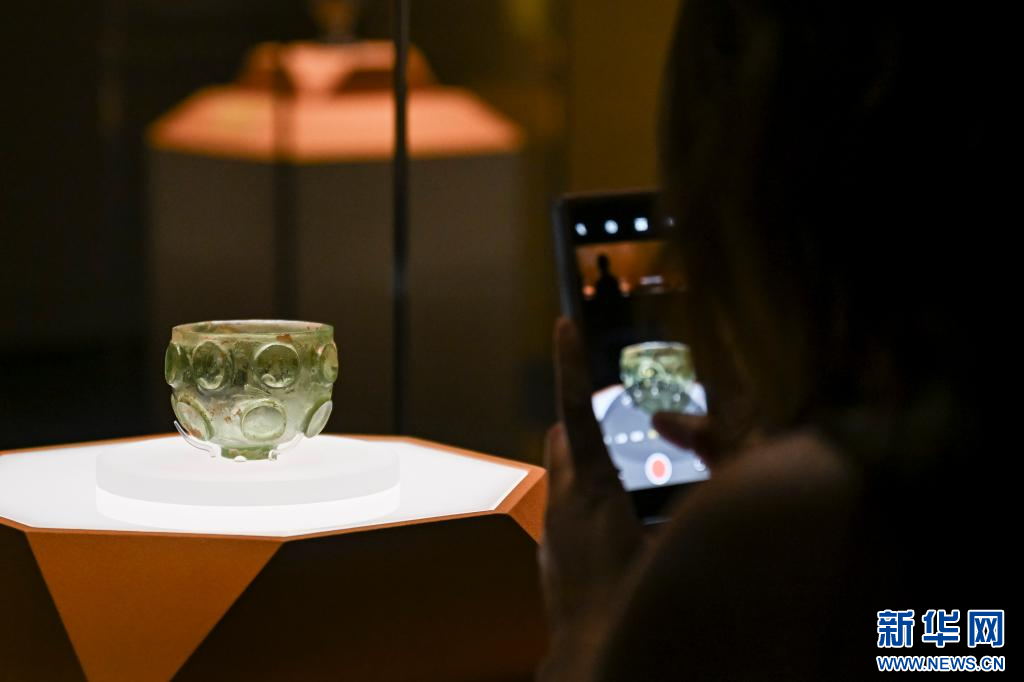 7月8日,媒体人员在“宁夏固原文物精品展”上拍摄展品凸钉玻璃碗。