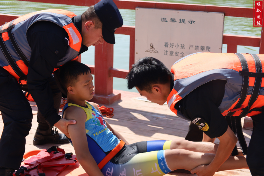 “喂,110吗?南山公园人工湖有小孩溺水!”演练模拟一名男孩私自下水游泳,返程时因体力不支遇险,巡逻人员发现后紧急报警。