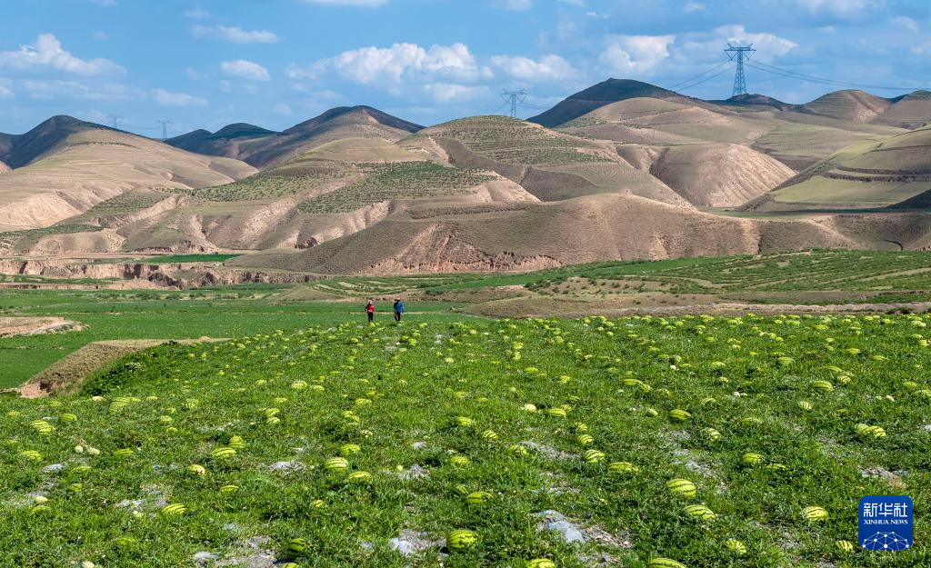 7月20日,农户在中卫市沙坡头区香山乡硒砂瓜田里劳作。