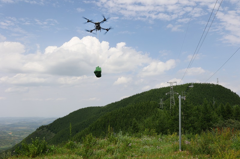 “嗡嗡嗡”……随着工作人员操作遥控器,一架拥有强力旋翼的载重无人机抵达山头指定位置,将下方吊挂的80斤重的设备工具包精准释放。
