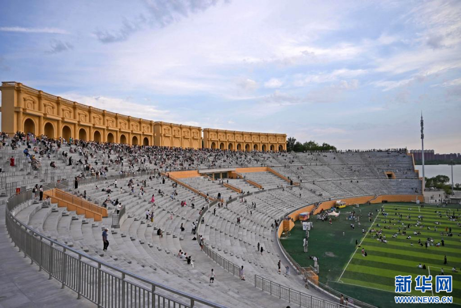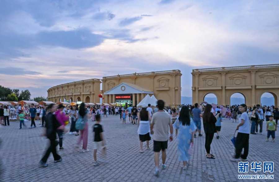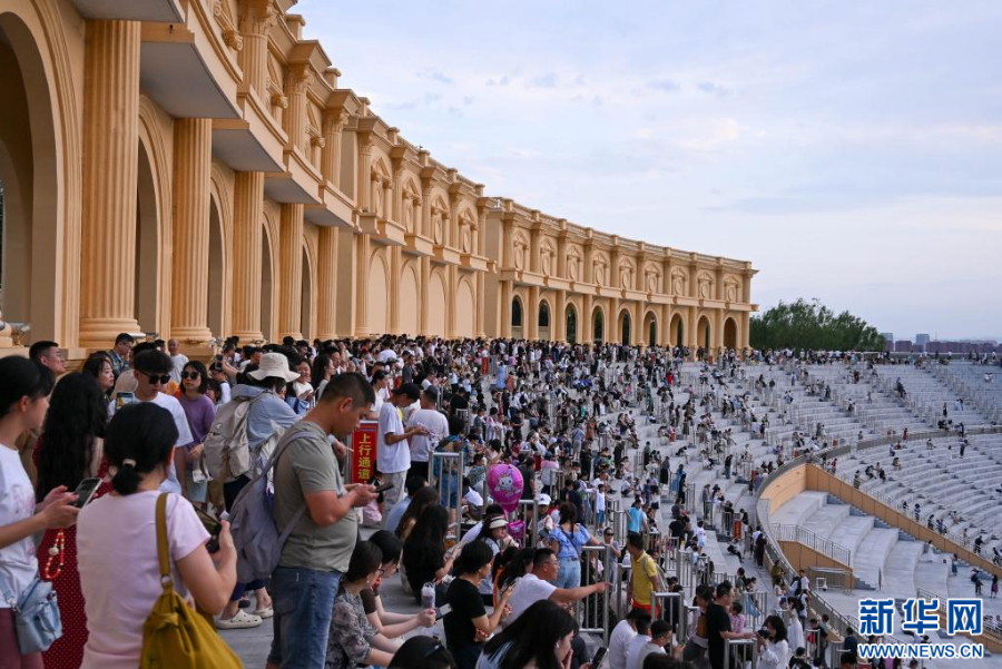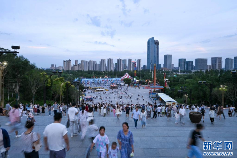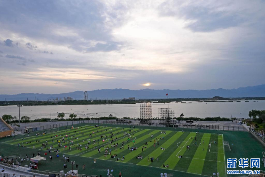 近日,宁夏银川览山公园迎来暑期客流高峰,每日黄昏时分,都有大批游客和市民前来打卡拍照,欣赏贺兰山日落景观。