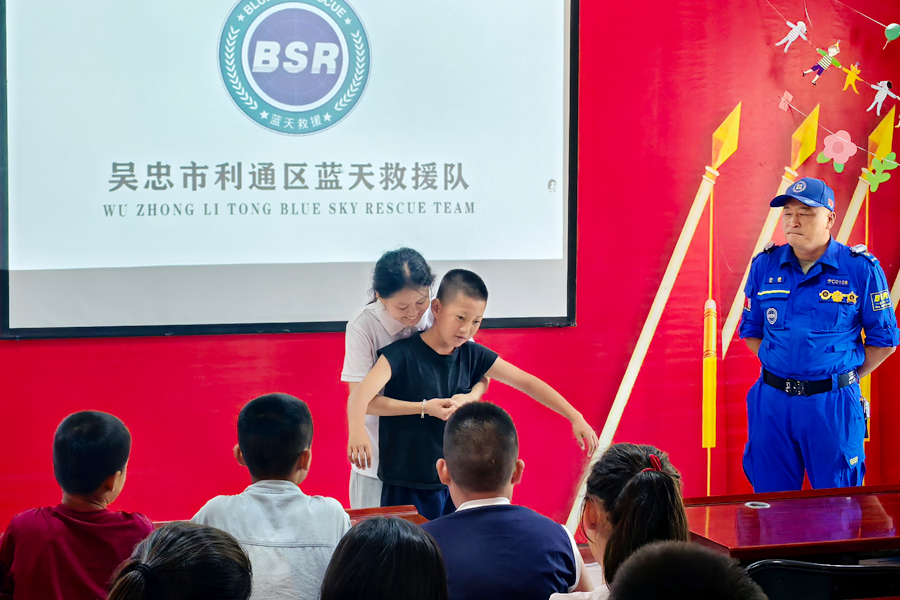 宁夏公安厅缉毒总队、吴忠市利通区蓝天救援队、吴忠市公安局孙家滩分局为孩子们带来毒品防护、防溺水救护、暑假安全教育实景演练。六年级的马婷兴奋地说:“第一次用假人练习心肺复苏,感觉自己像小医生!”