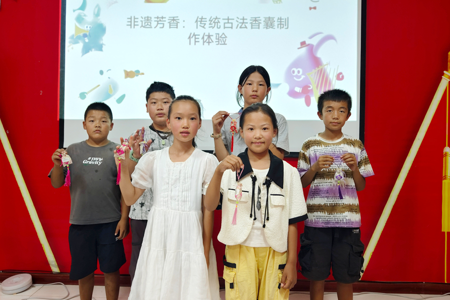 在《非遗文化之美:一漆童行》课堂上,志愿者余玲、陈昱琪带领孩子们用创意实践传承中华传统文化遗产;民族团结课,在全体师生的联合创作下,一幅长2×2米的民族团结手绘画,随着“石榴籽”底画一点点被填满,最终成为“石榴花开别样红,籽籽同心一家亲”的巨幅石榴籽涂鸦,吸引诸多村民驻足拍照。