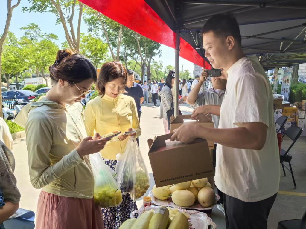机关干部正在摊位前购买农特产品。
