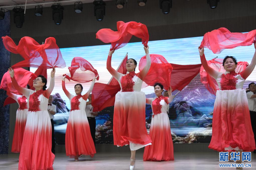 8月20日,银川市丽景街泰和社区天园艺术团舞蹈队在现场表演舞蹈《五星红旗》。新华社记者 王鹏 摄