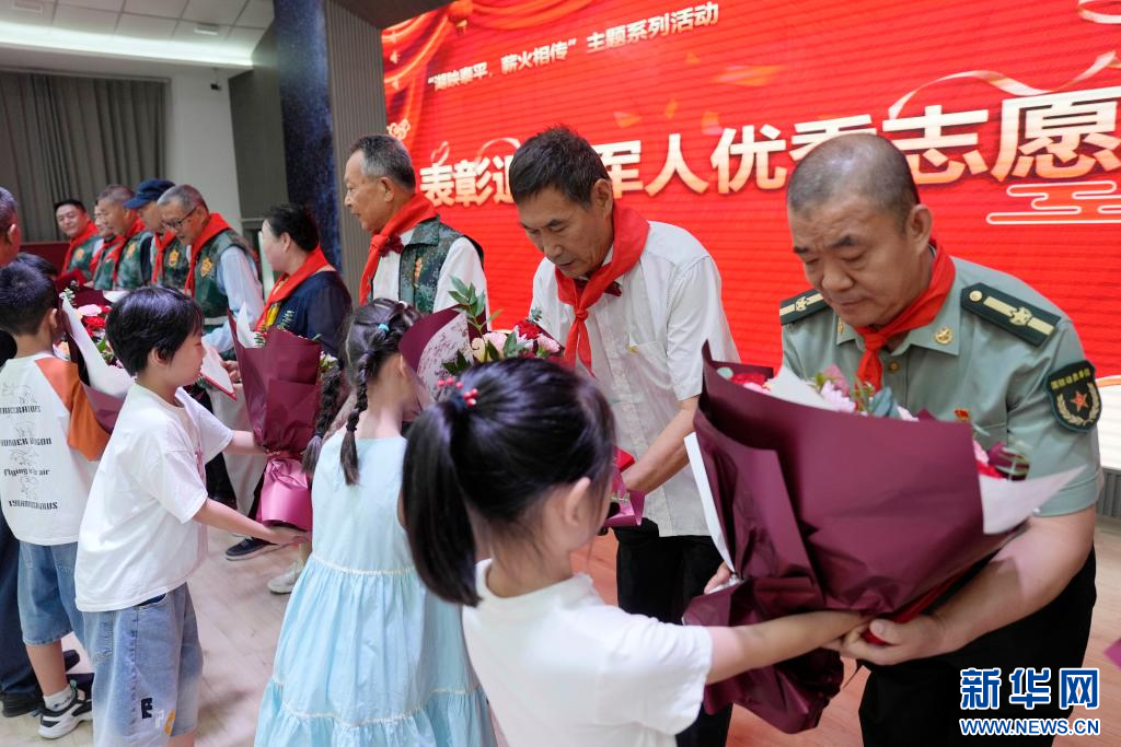 8月20日,活动现场少先队员为优秀退役军人代表献花。新华社记者 王鹏 摄