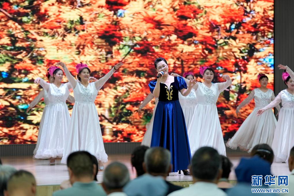 8月20日,银川市丽景街泰和社区天园艺术团演员在现场表演歌伴舞《山楂树》。新华社记者 王鹏 摄