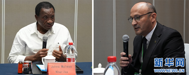 在中国—中亚荒漠化防治合作交流会现场,与会嘉宾交流发言。(拼版图片)