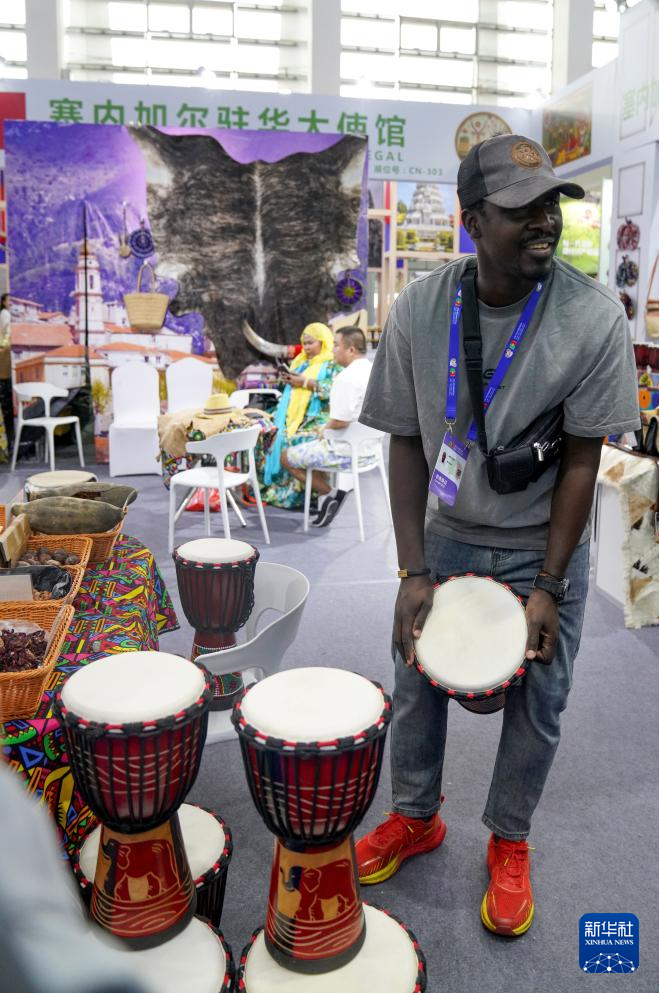 8月28日,塞内加尔展商在第七届中国—阿拉伯国家博览会为观众表演非洲鼓。新华社记者 赵宇思 摄