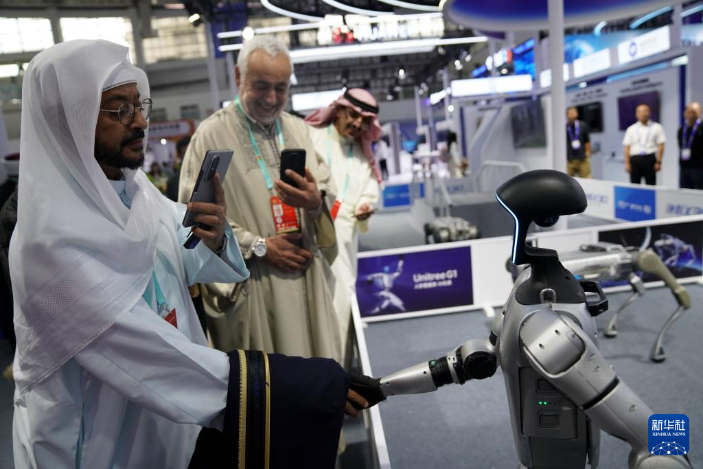 8月28日,嘉宾在第七届中国—阿拉伯国家博览会与一款人形机器人握手互动。新华社记者 赵宇思 摄