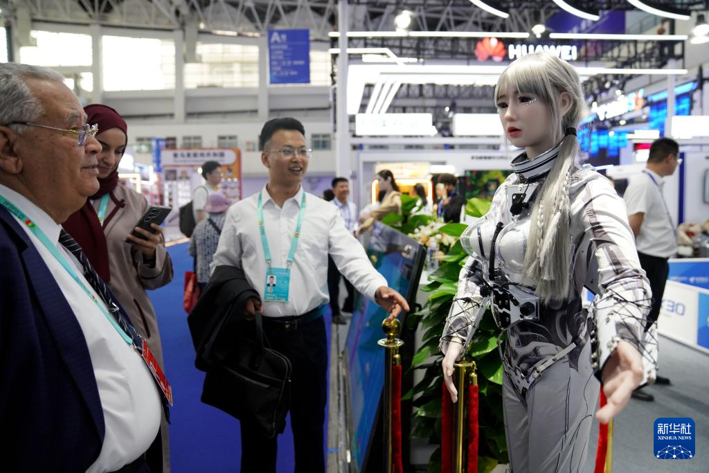 8月28日,嘉宾在第七届中国—阿拉伯国家博览会与一款机器人对话互动。新华社记者 赵宇思 摄
