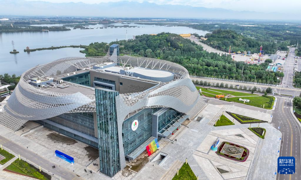 这是8月28日在宁夏银川市拍摄的第七届中国—阿拉伯国家博览会开幕式举办地——宁夏国际会堂外景(无人机照片)。新华社记者 冯开华 摄