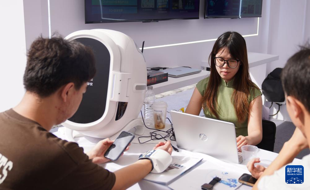 8月29日,一名参观者在展览现场体验中医脉诊仪“把脉”。新华社记者 赵宇思 摄