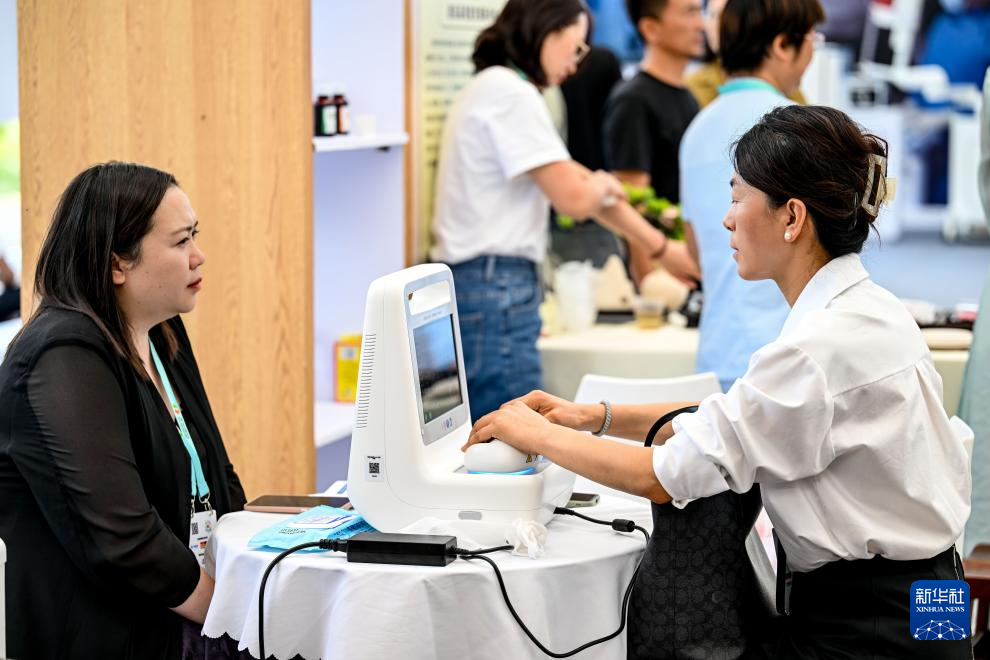 8月29日,一名参观者(右)在展览现场体验中医经络检测仪。新华社记者 冯开华 摄