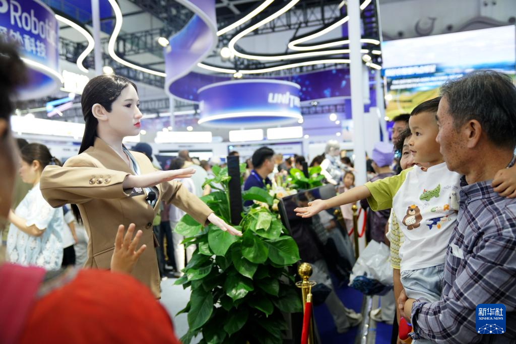 8月29日,观众在博览会现场与一款智能机器人互动。新华社记者 赵宇思 摄
