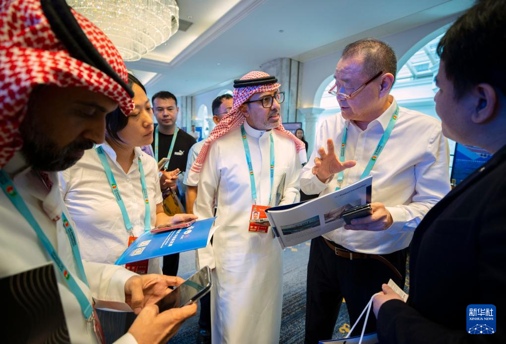 8月28日,在中国—阿拉伯国家经贸投资企业对接会上,参会嘉宾(右三)与企业人员在会议间隙进行商务洽谈。新华社记者 杨植森 摄