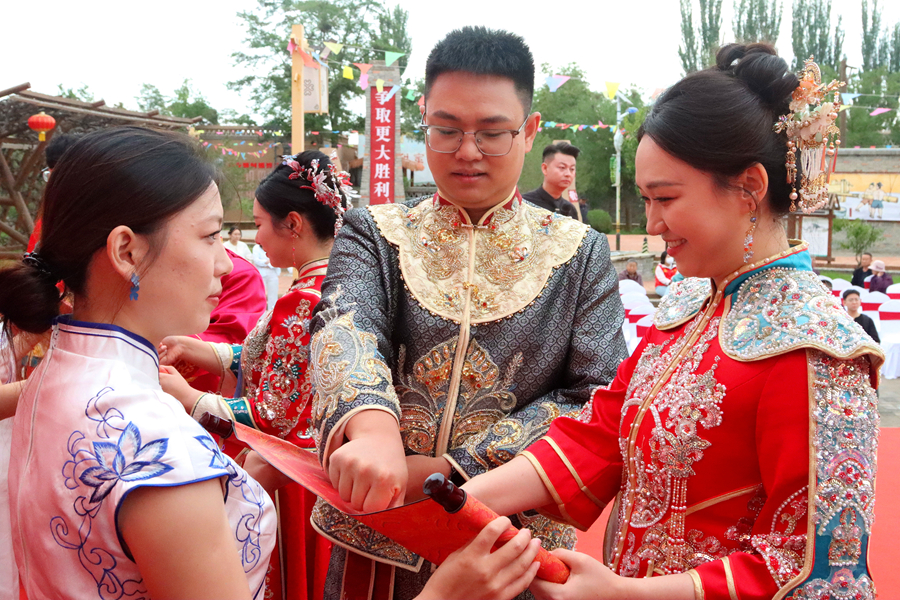 礼成后,利通区委社会工作部为新人们颁发了“零彩礼”“低彩礼”荣誉证书。这份特殊的“文明勋章”,与婚书共同见证新人们践行移风易俗、倡导婚嫁新风的决心。新人代表现场宣读《移风易俗倡议书》,呼吁婚事新办简办,拒绝高价彩礼,争做新时代婚恋文明的践行者。仪式最后,主办方向新人赠送“非遗大礼包”和书画卷轴,以艺术形式传递良好家风与文明理念。