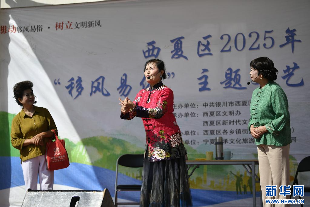 9月10日,宁夏银川市西夏区2025年移风易俗主题文艺巡演在西夏区朔方路街道同心苑社区举办,演员们用歌舞、快板、小品等丰富多彩的形式,为居民献上一场精彩演出。