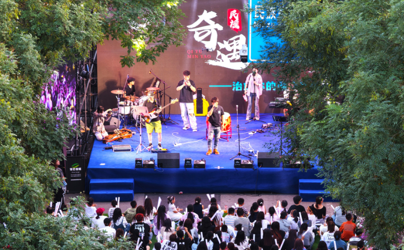 此次活动还为评选出的敬德商圈“五星商户”,社区“好居民”“好组织”及“好小哥”等进行表扬。傍晚时分,暮色渐浓,现场灯光骤然亮起,“中华民族一家亲 同心共筑中国梦暨‘奇遇民谣演唱会’”正式启幕。舞台上民族乐器与现代吉他交织,歌手弹唱着融合多民族元素的民谣,台下观众挥舞荧光棒,跟着旋律轻声合唱,欢呼声与音乐声此起彼伏,温暖的氛围瞬间点燃全场热情。