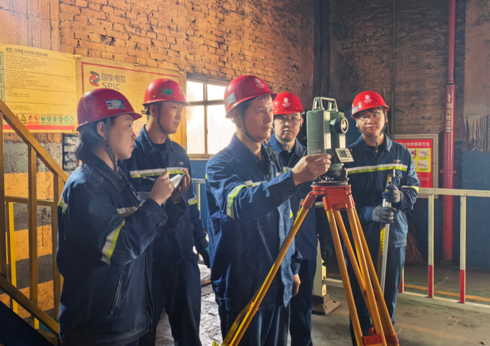 邓宏兴(中)为新入职技术员讲解设备操作要点