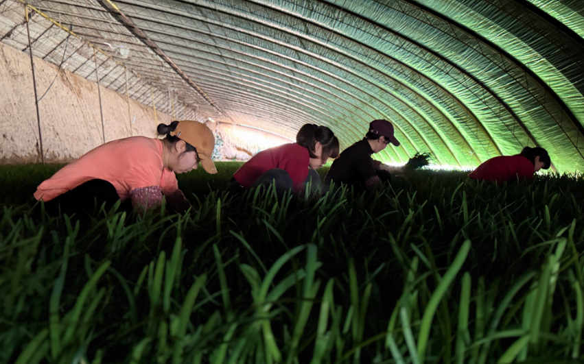 如今,韭菜产业已成为郝家桥镇农民增收的“摇钱树”。全镇韭菜种植总面积达1.62万亩,其中露地韭菜0.25万亩,年生产韭菜3.24万吨,实现总产值1.68亿元,户均年增纯收入3.65万元。“自2016年建棚以来,韭菜产业已发展十年,今年收购最高价格达到5元每斤。”大泉村村委会副主任杨成伏介绍,除冬季收割鲜韭菜外,还通过加工韭花、韭苔、韭花酱延伸产业链,旺季时能带动周边二三百人实现就近就业。